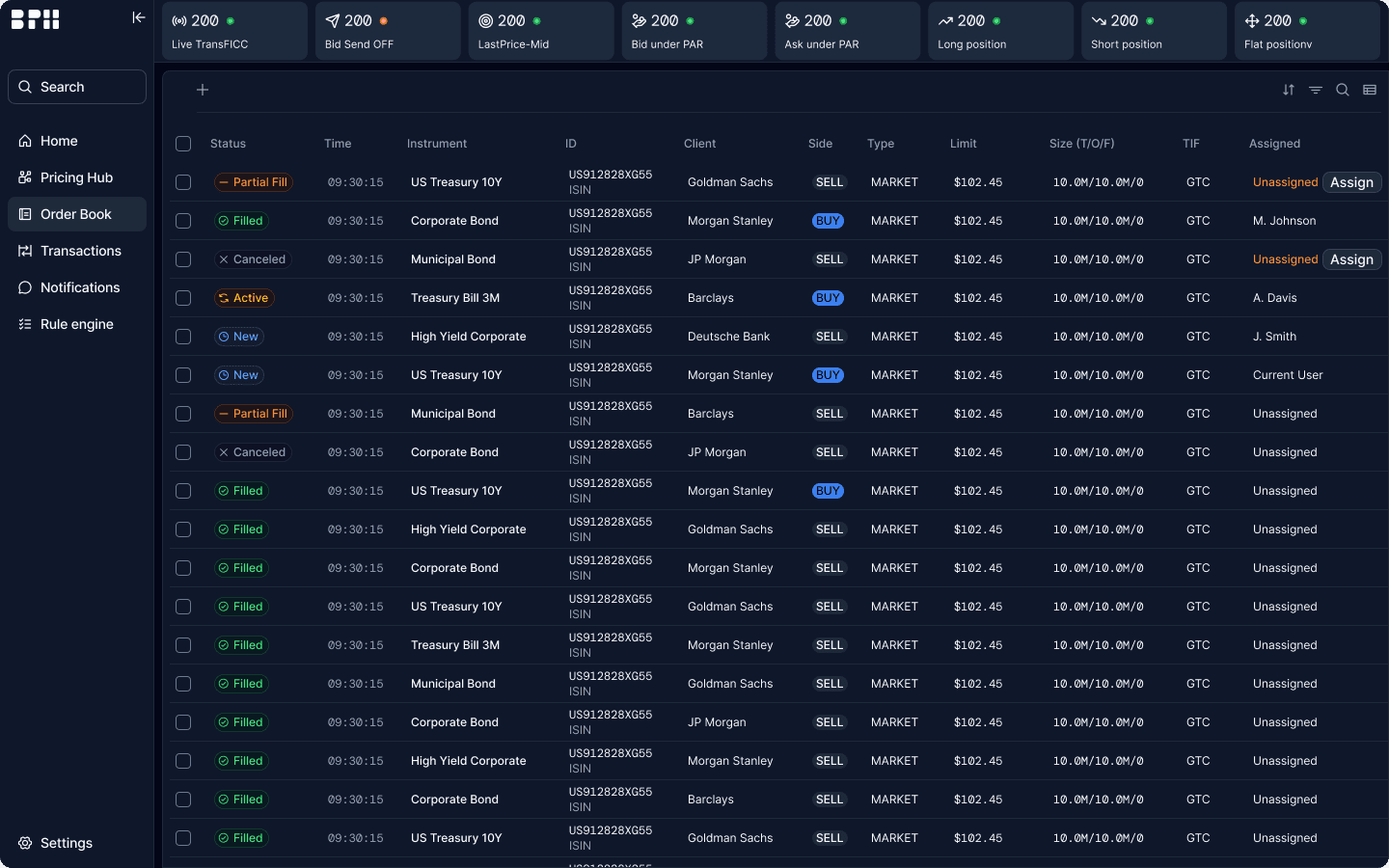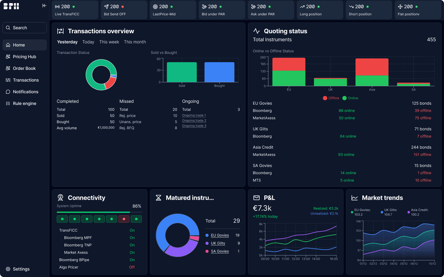 A real-time bond trading platform that turns chaotic pricing decisions into controlled, profitable workflows. It combines live market data from 60+ venues with intelligent automation and clean dashboards, helping traders price bonds faster, smarter, and without losing millions to manual errors or missed opportunities.
